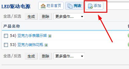 這樣就很容易增加了一個產品分類了。下面教大家如何新增一個產品,見下圖,在產品中心下面隨便點一個產品分類進去,見下圖:
