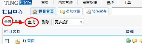 注意:由于本系統采用了html純靜態生成技術(好處多多),你可能在修改資料或新增資料的時候,見不到效果,在這種情況下,你可以回到“欄目中心”,按照下面的圖示,先點全選,再點生成,刷新下你修改的那個欄目或文章就可以了,如果只是想見到修改后的某一篇文章或產品頁面有沒效果,修改完后,刷新下你的文章或產品頁就行,文章或產品頁在修改后就已經自動生成了。